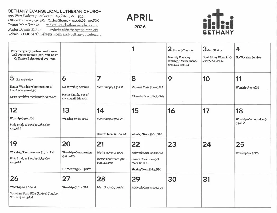 Here are some of the regular publications that go out at Bethany. If there's anything else that you're looking for, we probably can find it for you! Send us a request through our contact form and we'll get it to you as soon as we can.